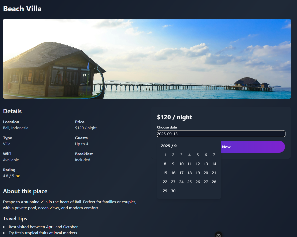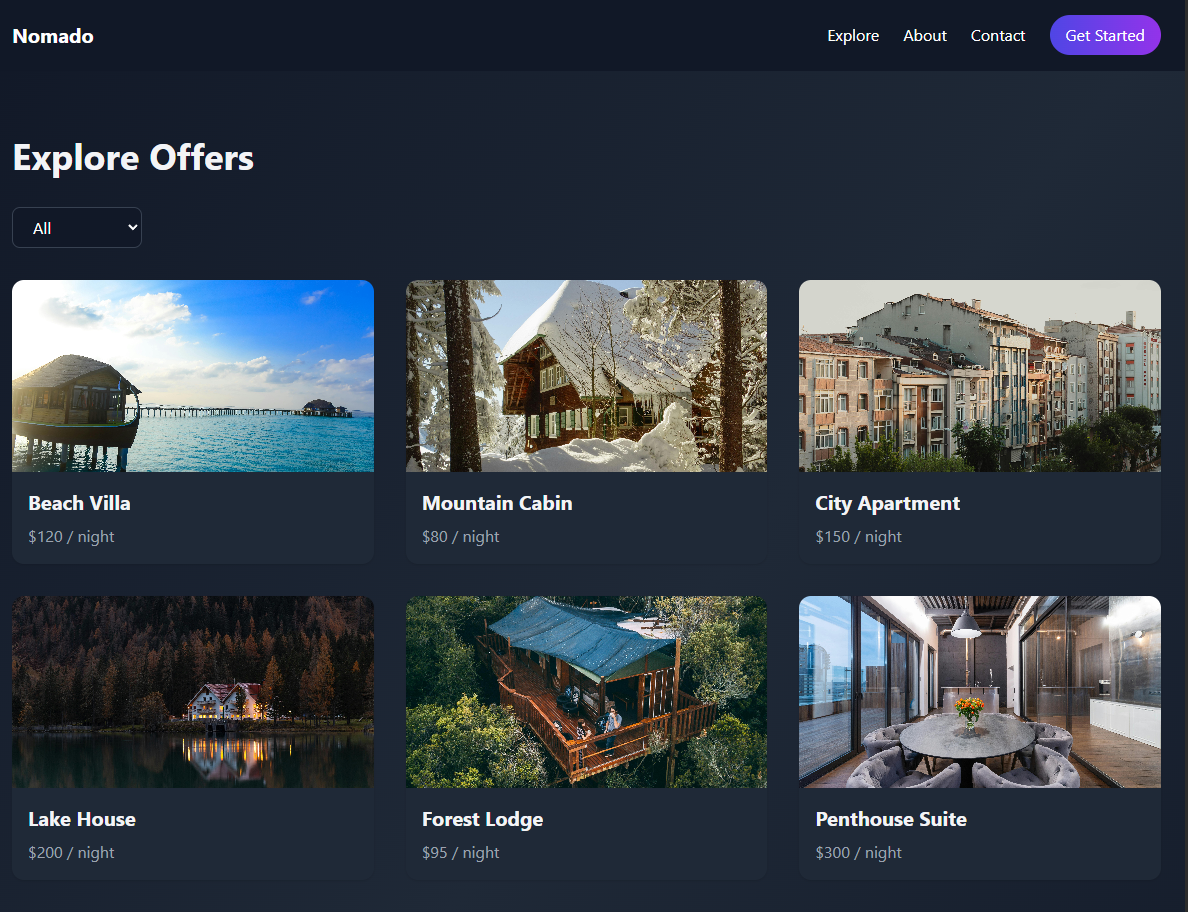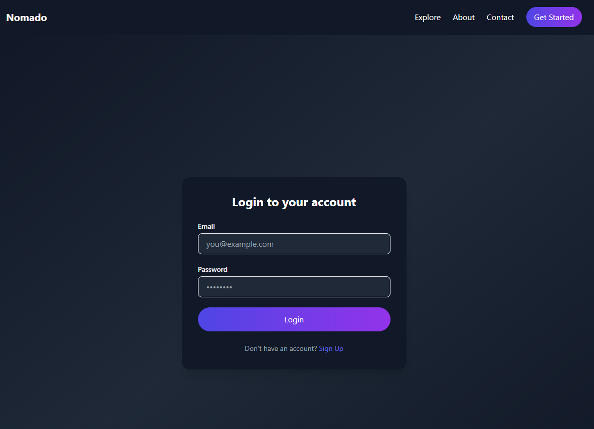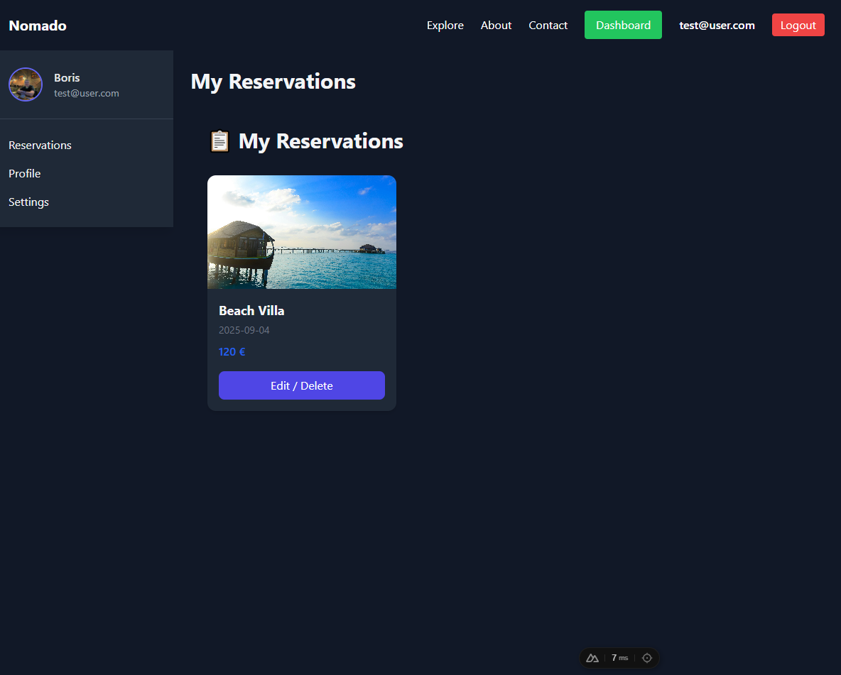 Nomado is a modern booking platform that allows users to explore experiences, make reservations, and manage their bookings via a personal dashboard. It includes user authentication, profile management with avatar, interactive booking cards, toast notifications, PAY.nl payment integration, dark mode, and multi-language support with vue-i18n. The platform is fully responsive and optimized for both desktop and mobile devices.