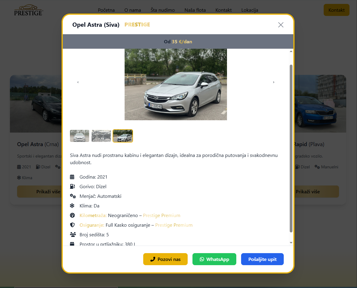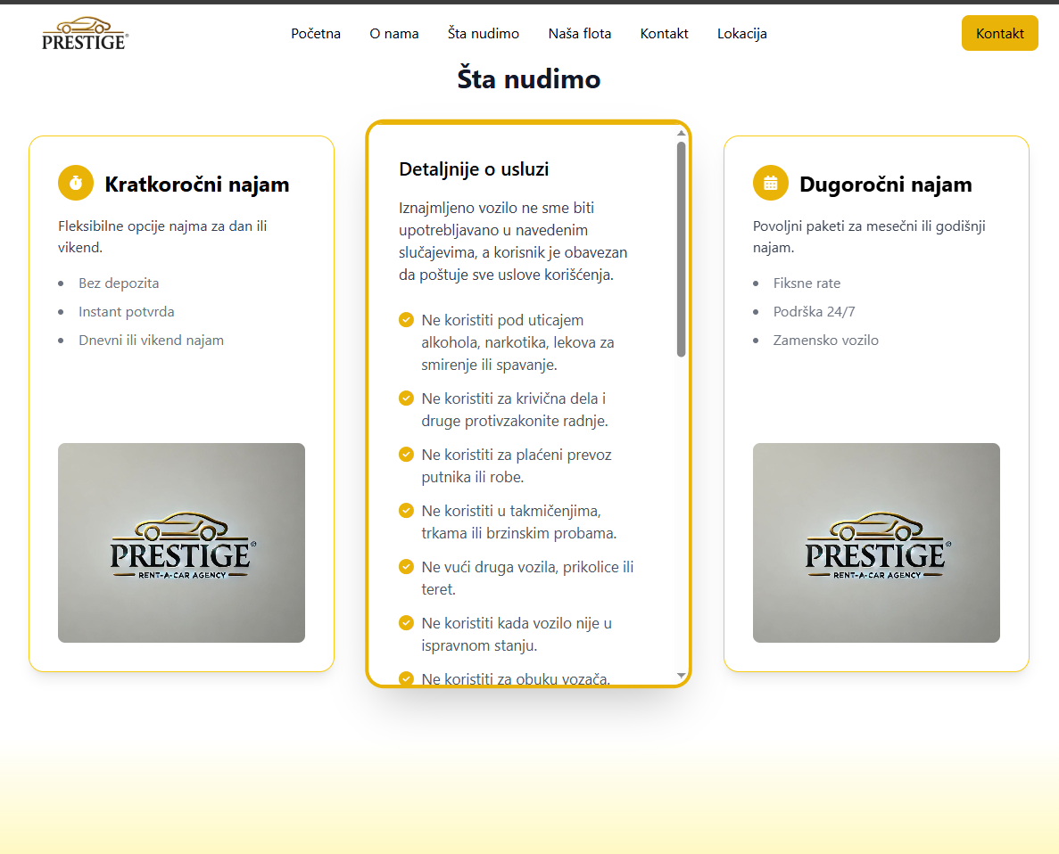 Prestige Rent-A-Car offers flexible and fast car reservations with no deposit required. Visitors can choose between short-term, long-term rentals, explore the entire fleet, and easily contact us via form or phone. Everything is optimized for mobile devices and the location is easy to find on the map.